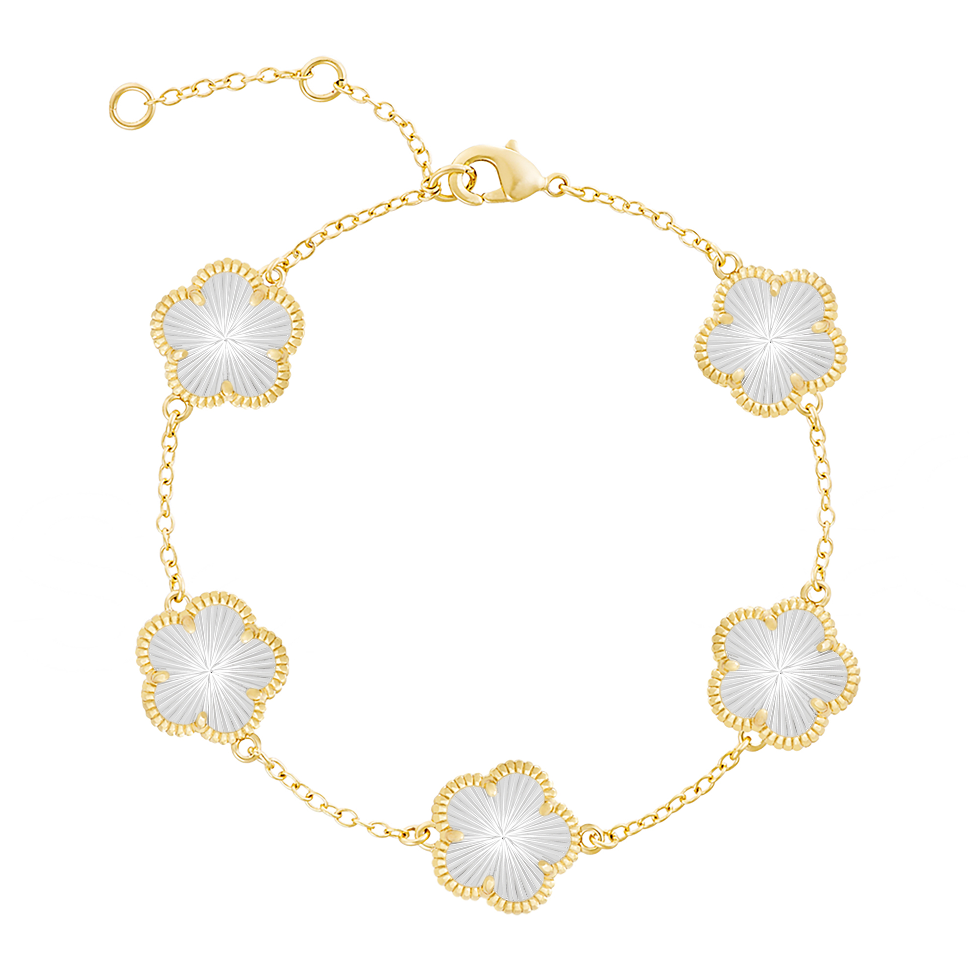 This beautiful bracelet has five engraved silvertone flowers charm and is made from 14K goldplated brass.