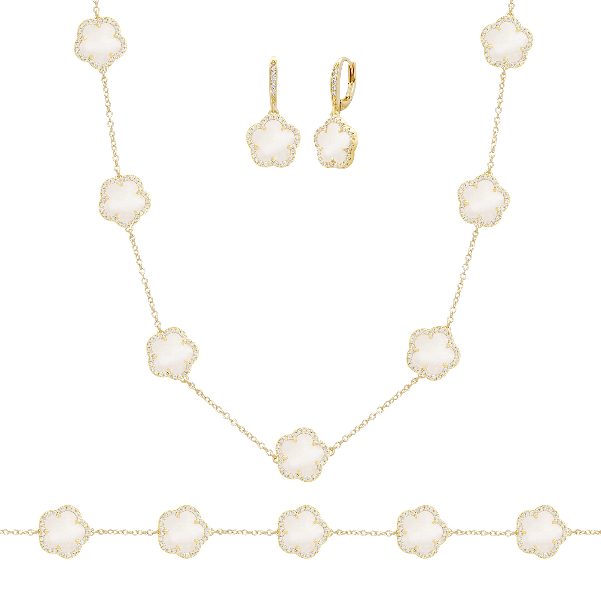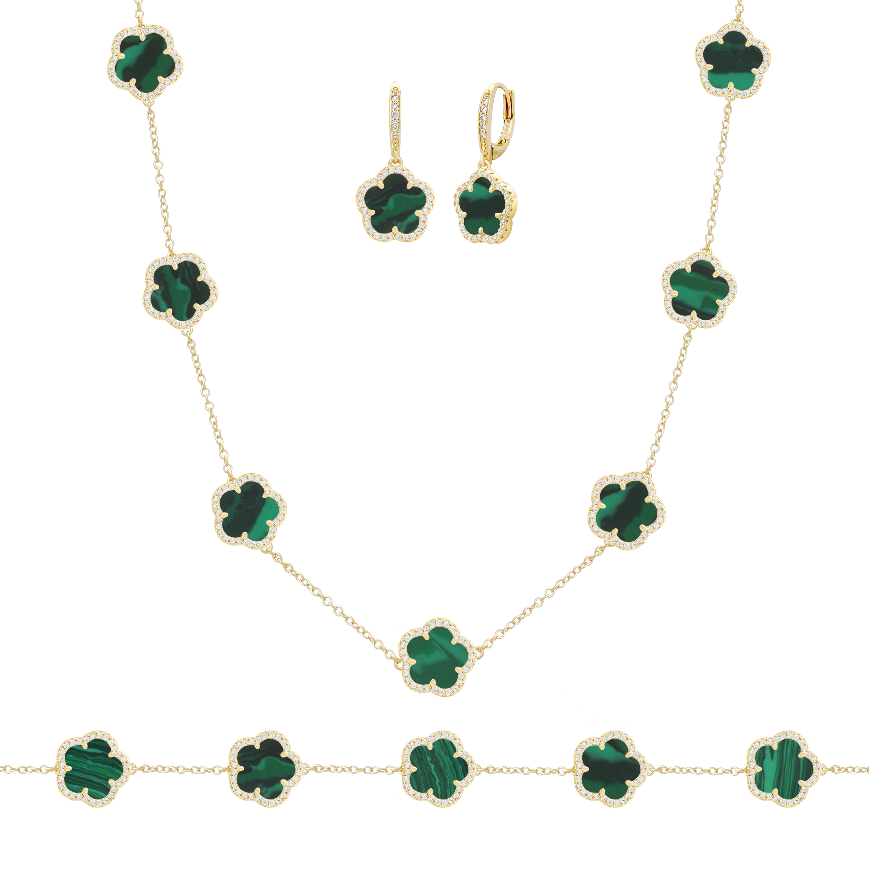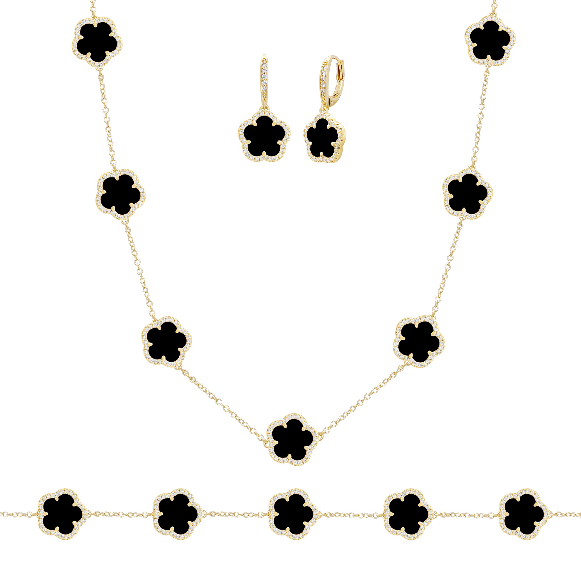 From the Flower Collection. This JanKuo jewelry set includes a necklace, bracelet, and stud earrings crafted in 14K goldplated metal. Each piece is accented with black onyx and cubic zirconia detailing.