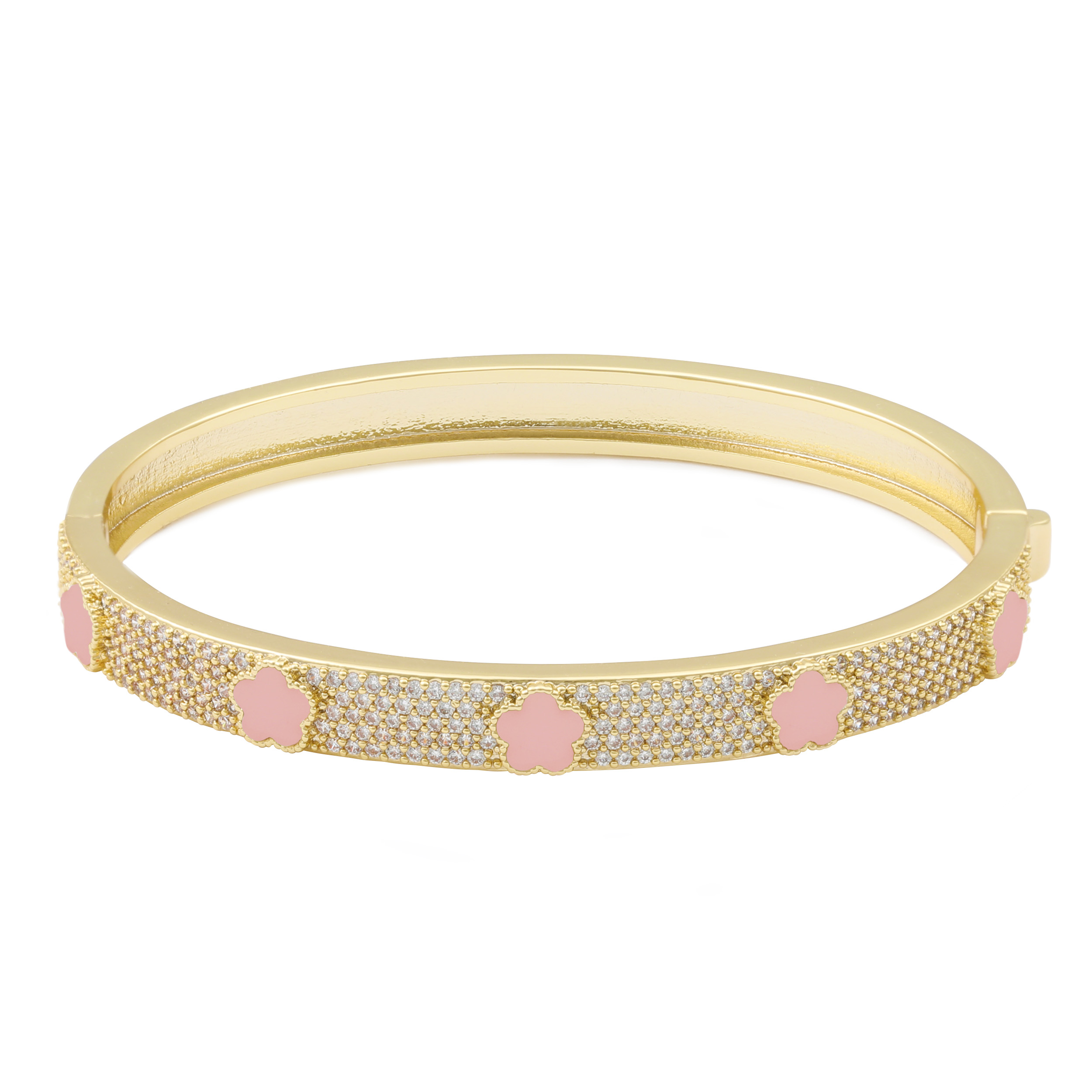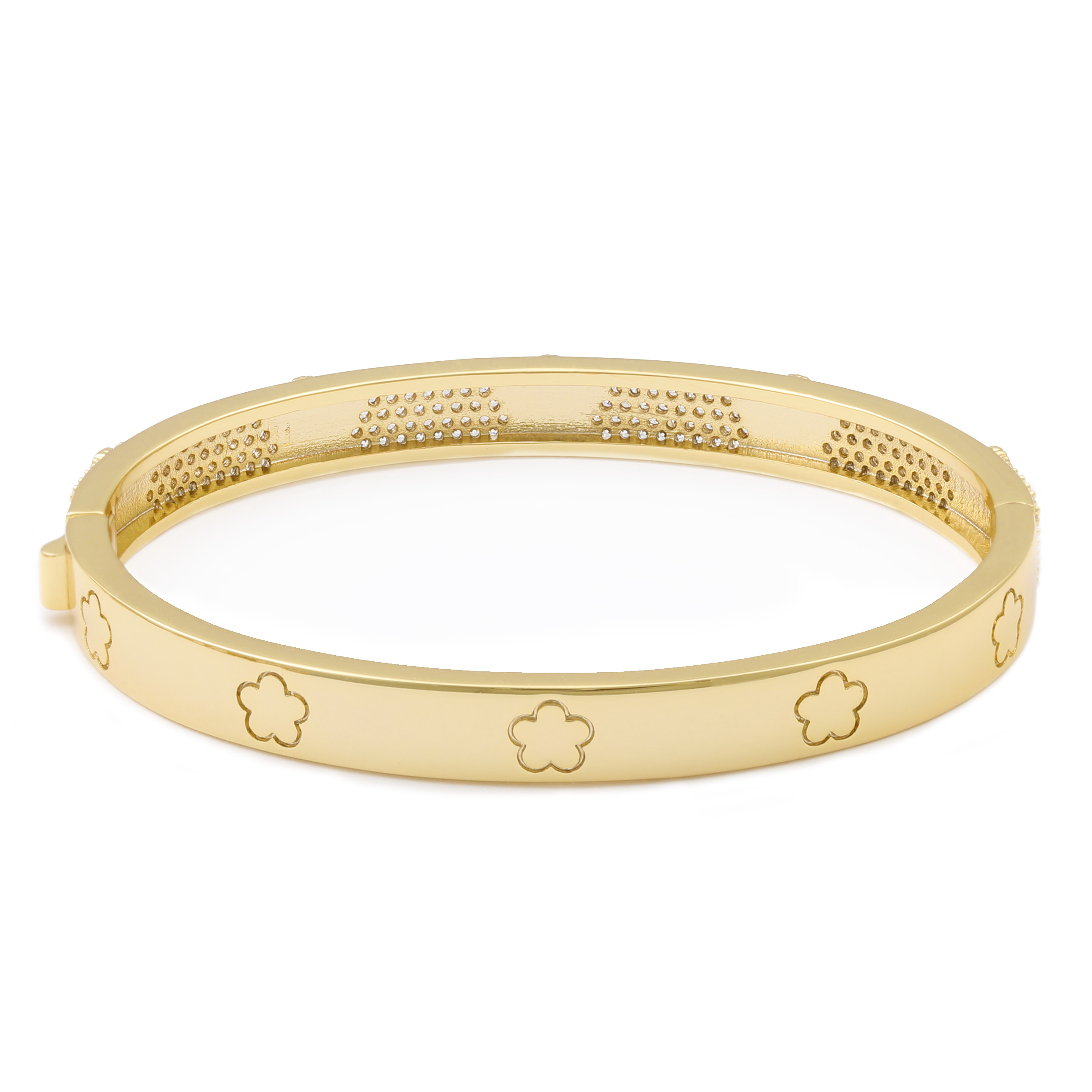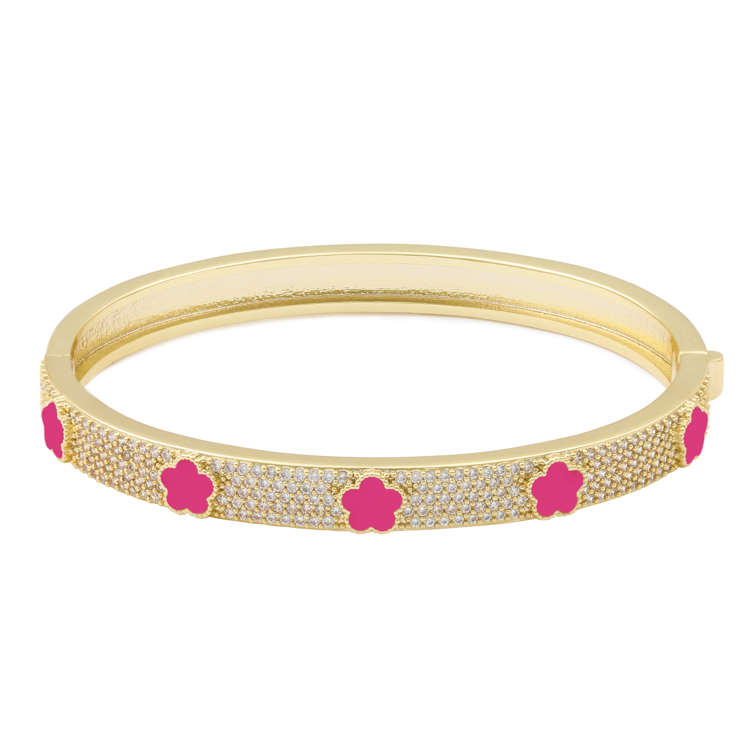 From the Flower Collection. This bangle bracelet from JanKuo is crafted of 14K goldplating and features synthetic emerald flowers and clear cubic stones.