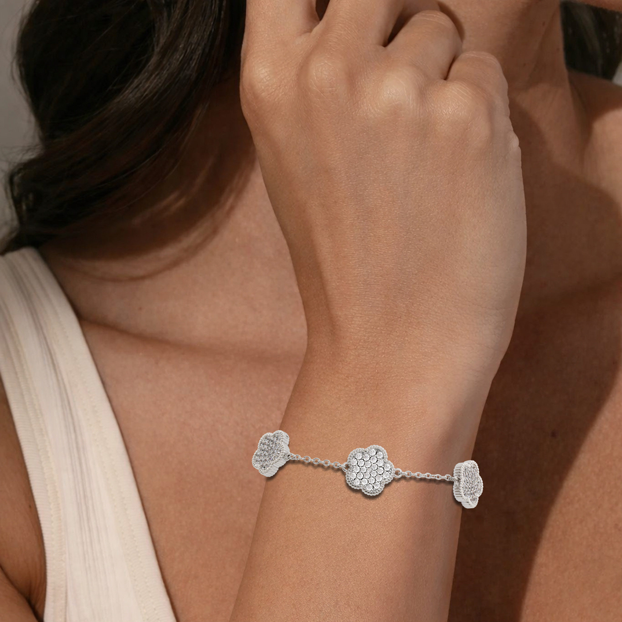This beautiful bracelet has pave CZ stone flowers charm and is made from 14K goldplated brass.