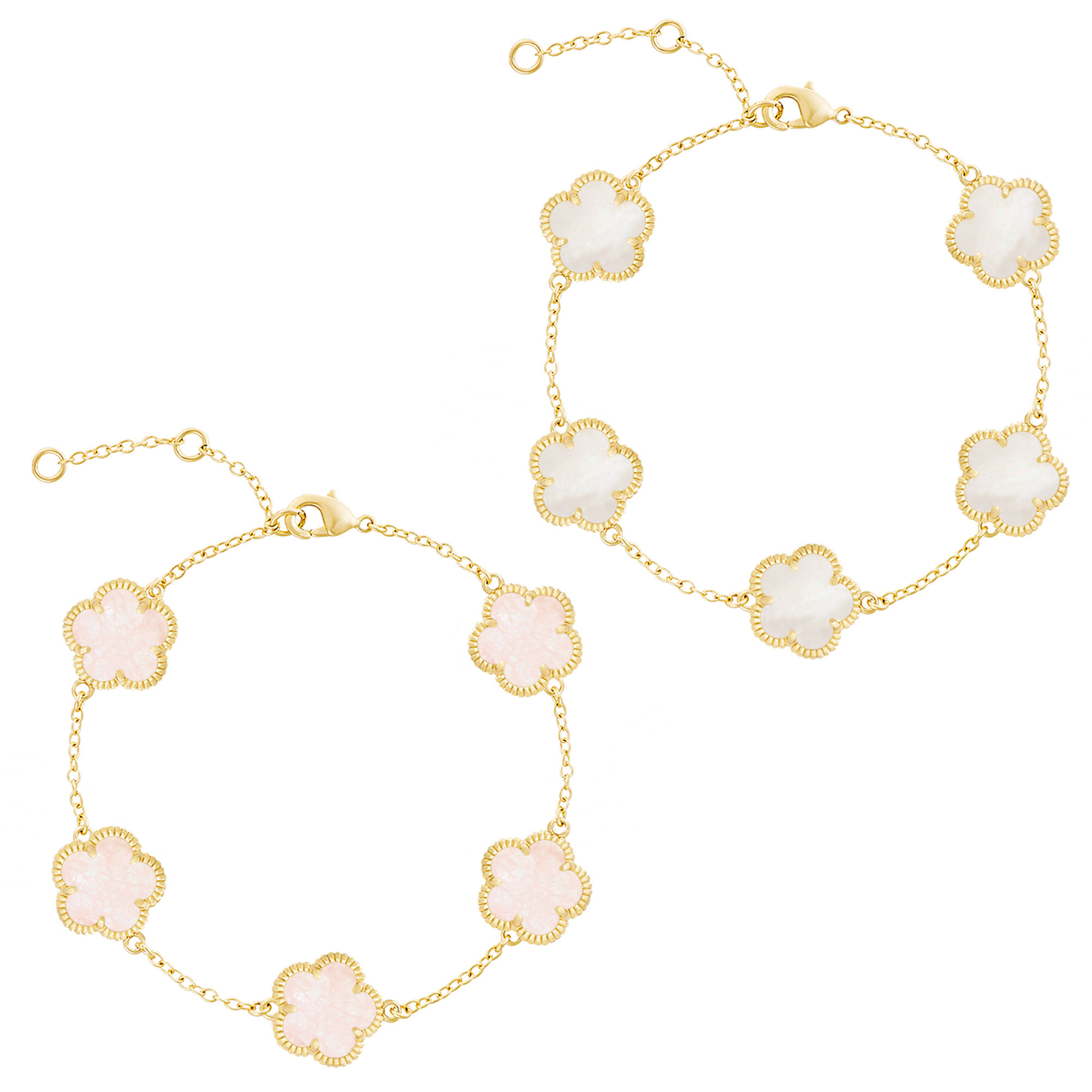 From the Flower Collection. These two pieces with Mother-of-pearl and pink crystal will add a modern yet classic statement to your jewelry collection.