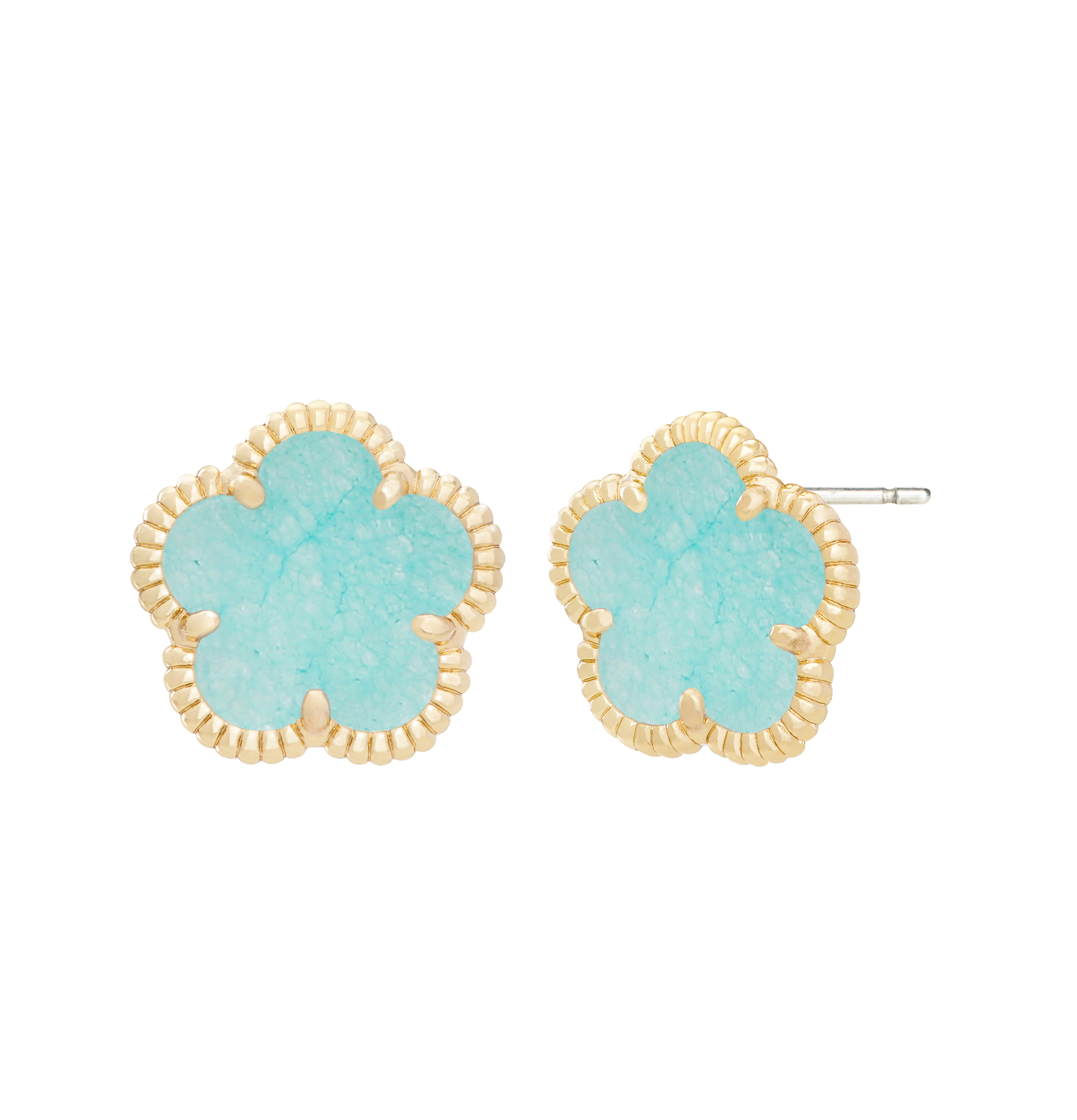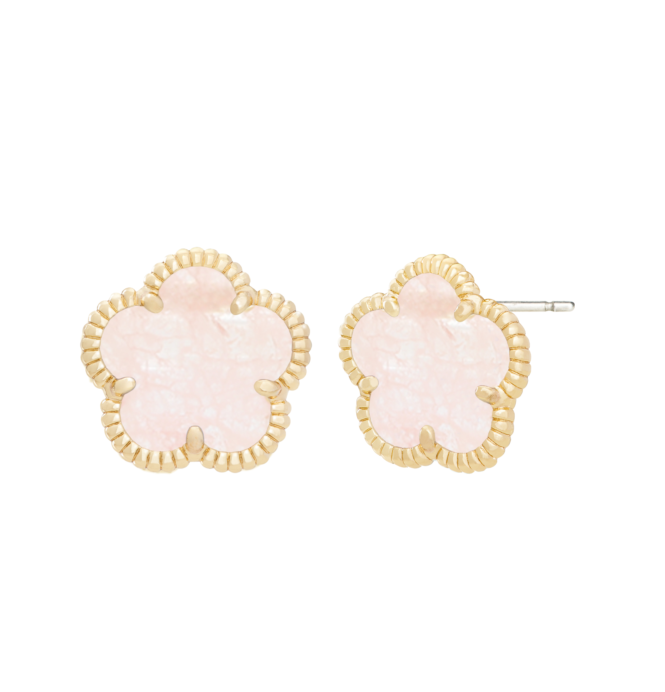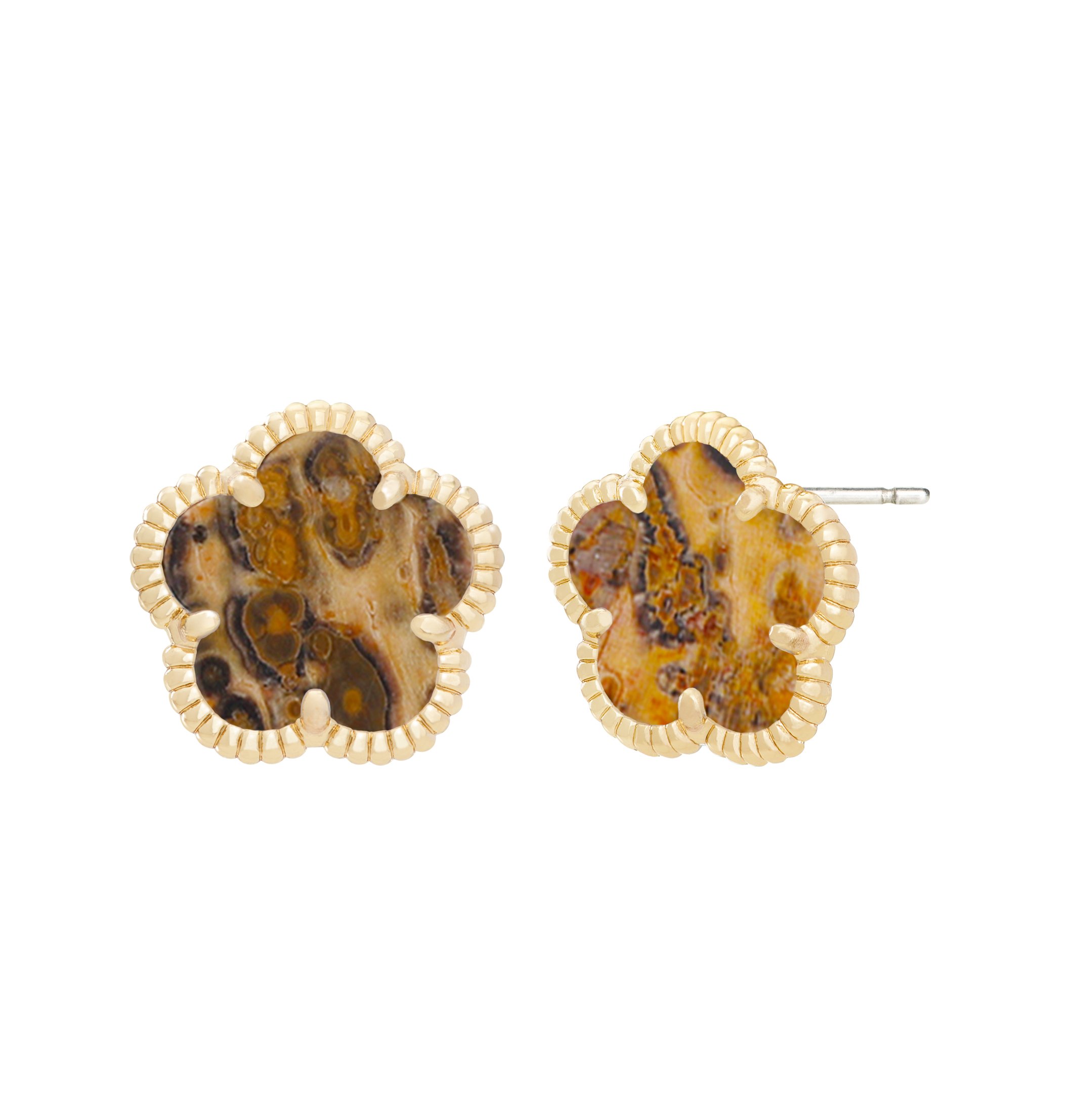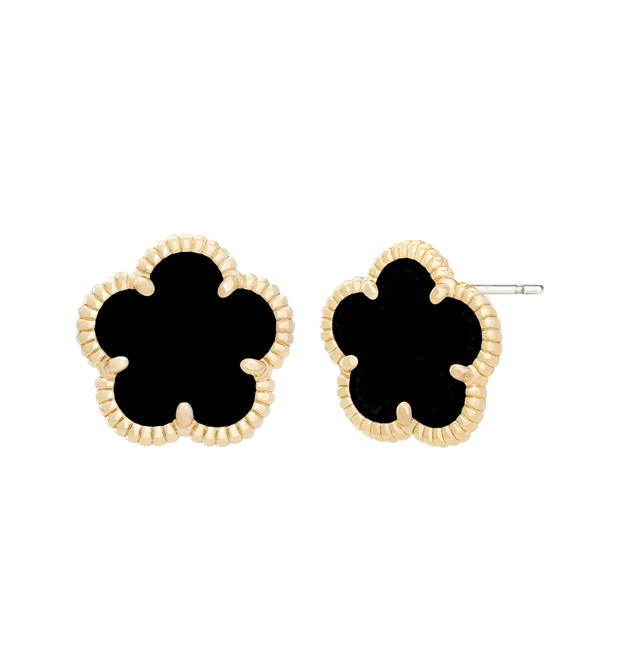 From the flower collection collection. These flower stud earrings are made of 14K gold plating and set with synthetic grey stones.