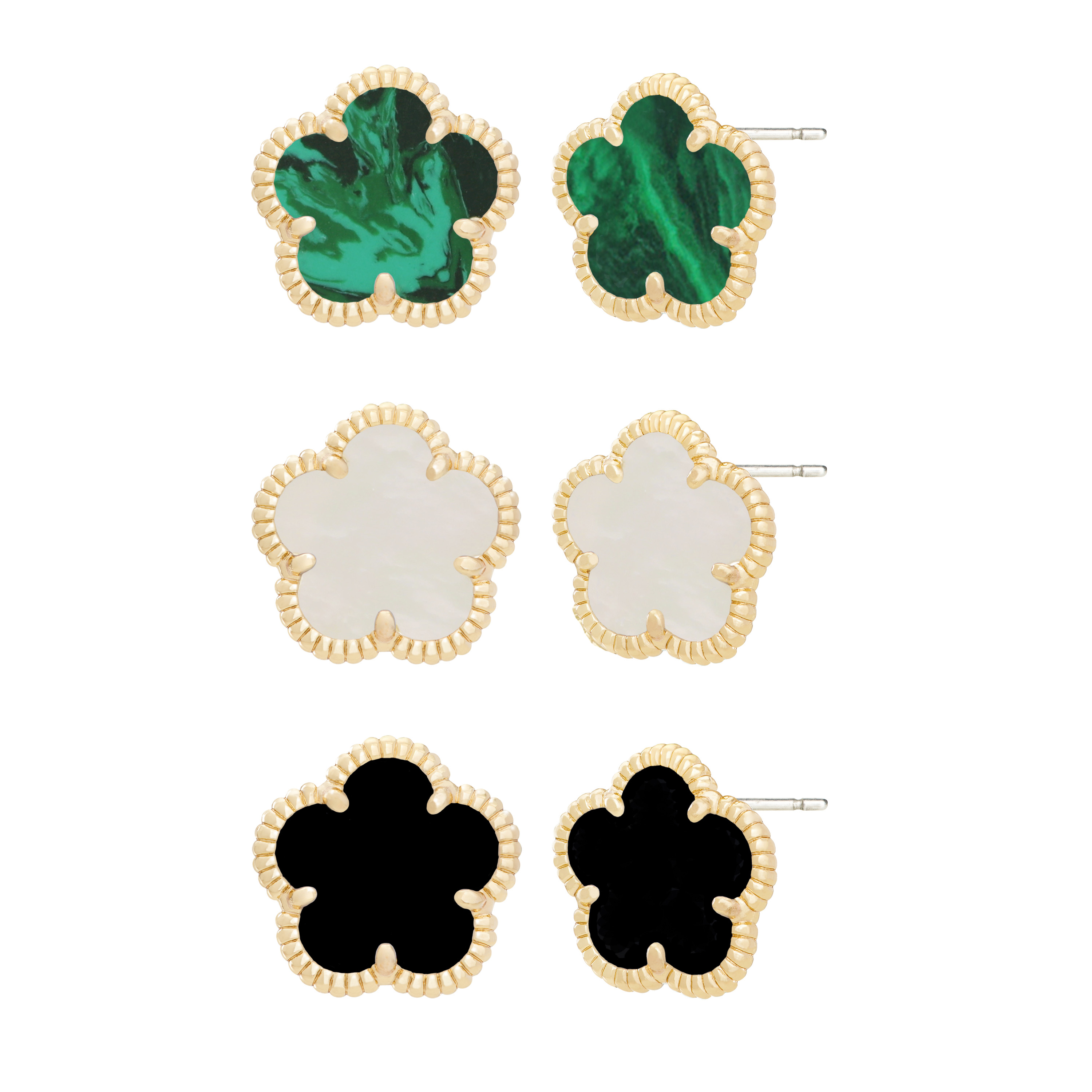 From the flower collection collection. These flower stud earrings are made of 14K gold plating and set with synthetic stones.